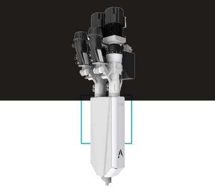 Extruderul xHF dispune de cameră dublă și duze personalizate, permițând procesarea simultană a două materiale, fiind destinat producerii pieselor compozite de înaltă performanță, pentru o utilizare mai precisă și mai eficientă a materialelor.
