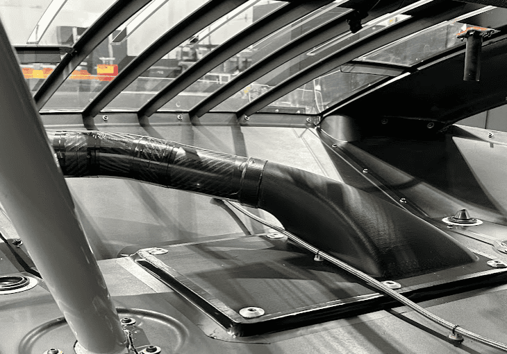 Operăm două imprimante BigRep STUDIO aproape non-stop. Ele produc dispozitive de fixare și șabloane care ne ajută să lucrăm constant, săptămână de săptămână, dar și piese funcționale care ajung direct pe mașină. De exemplu, imprimăm conducte pentru nasul sistemului de frânare frontală — piese de unică folosință, care nu ar fi practice de realizat din carbon. De asemenea, imprimăm un plenum mare pentru răcirea cutiei de viteze, amplasat în partea din spate a mașinii. Acea componentă este mult prea mare pentru o imprimantă hobby, așa că avem nevoie de un sistem industrial, de format mare, cu control dimensional precis și volum generos de construcție.